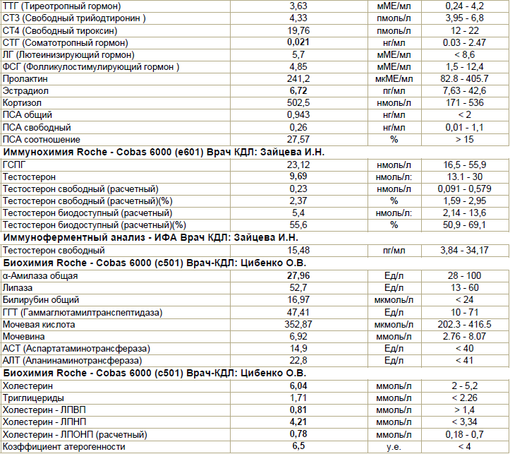 Ну, все у тебя по анализам нормально, почти. Щитавидка уже не айс, ТТГ высоковат, ну и тестостерон у тебя оч плохо выробатывается.