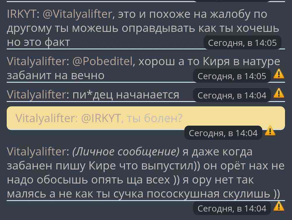 @Vitalyalifter Слышь стукачок, одно дело когда ты в общий чат пишешь всякую мне хрень, я ее воспринимаю как просто шуточки, другое дело ты в личку парням называешь крысой... Обоснуй свои слова...если не обоснуешь, то предлагаю руководству форума забанить тебя на месяцок, может после этого поумнеешь... Думай своей бошкой лучше и смотри где грань