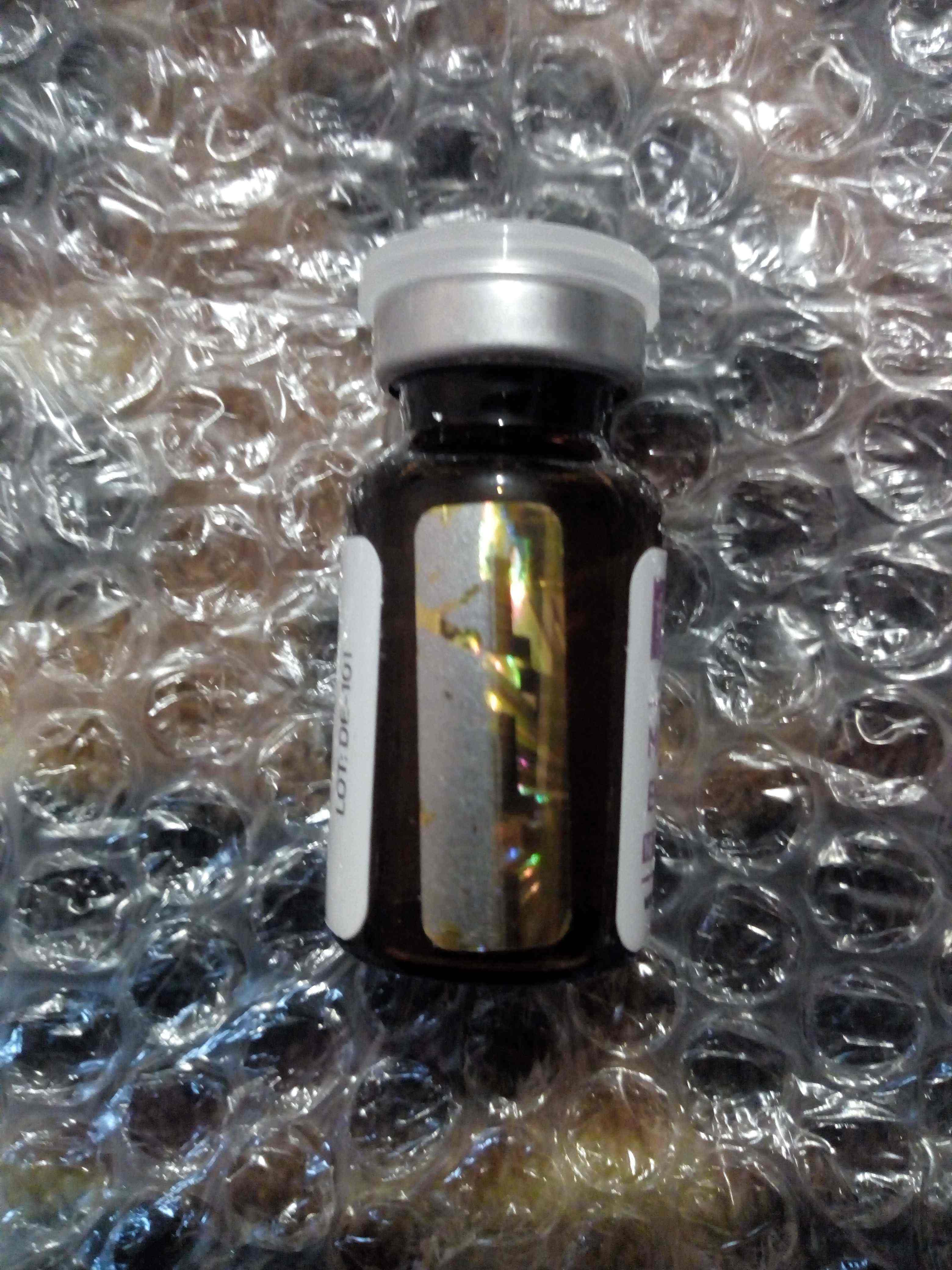 Фото виалы с защитной голограммой и кодом, выглядит солидно.