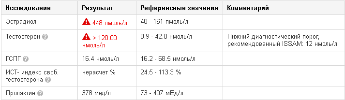Эстро было завышено в два раза, ты порекомендовал анастразол 1мг в день на 7 дней, после чего пересдать анализы, помимо этого принимал Достинекс 0,25 раз в 10 дней, 4 раза т.к. Прогестерон и пролоктин в верхних границах были. Сеичас жалею что не сдал на тесто.